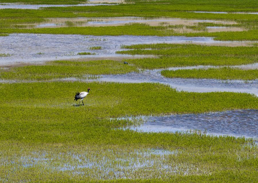 A drone photo taken on June 8, 2024 shows a black-necked crane searching for food at a wetland in Xainza County of Nagqu City, southwest China's Xizang Autonomous Region. (Xinhua/Jiang Fan)