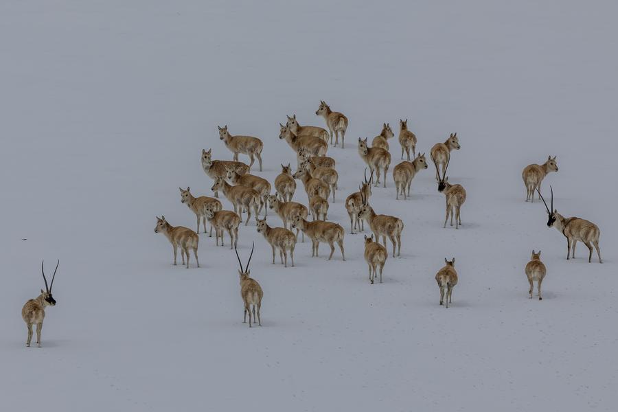 Tibetan antelopes are pictured on Qiangtang grassland, southwest China's Xizang Autonomous Region, May 8, 2024. (Xinhua/Jiang Fan)