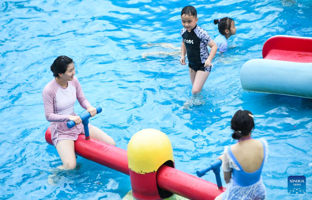 Children have fun at a water park in Fuling District, southwest China's Chongqing Municipality, Aug. 18, 2024. (Xinhua/Wang Quanchao)