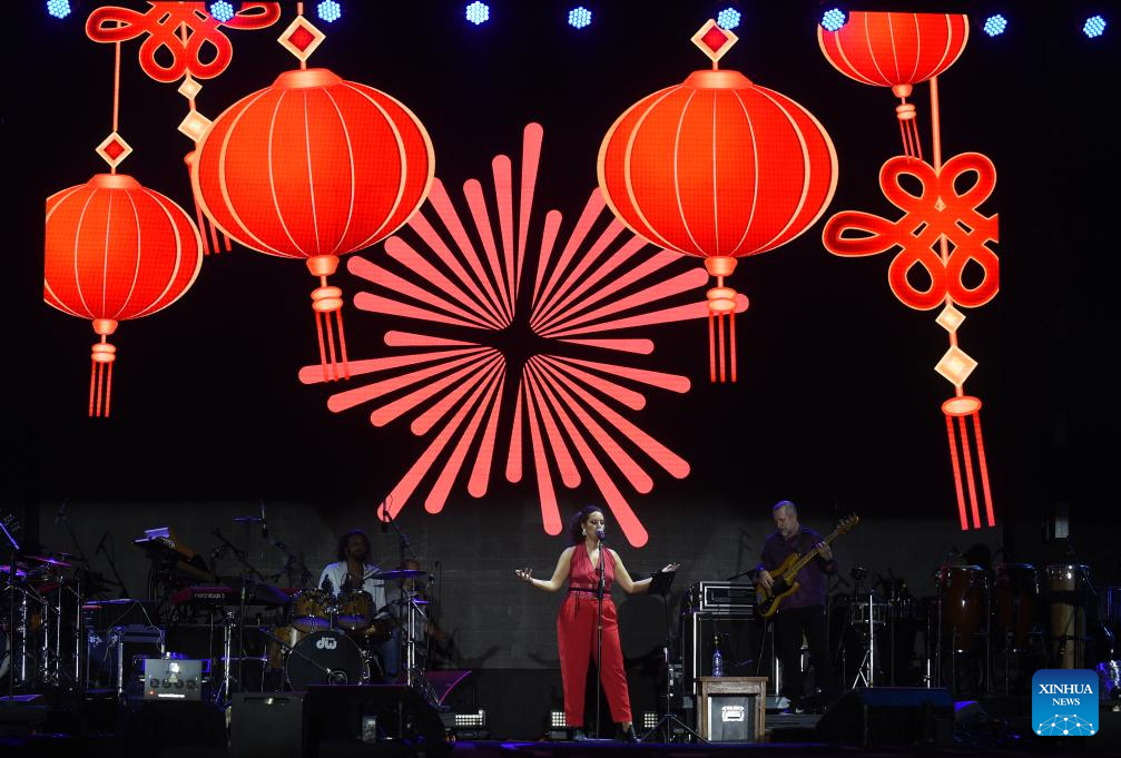 A band performs Chinese songs during the Na Praia Festival-China Day in Brazilia, Brazil on Aug. 17, 2024. This event was held here on Saturday in commemoration of the 50th anniversary of the establishment of diplomatic relations between China and Brazil. (Photo by Lucio Tavora/Xinhua)