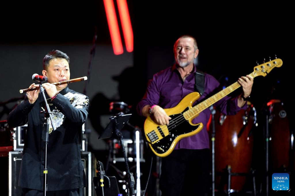 Chinese and Brazilian musicians perform during the Na Praia Festival-China Day in Brazilia, Brazil on Aug. 17, 2024. This event was held here on Saturday in commemoration of the 50th anniversary of the establishment of diplomatic relations between China and Brazil. (Photo by Lucio Tavora/Xinhua)