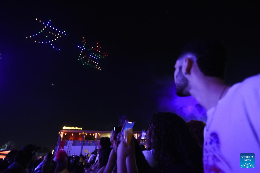 People watch a drone light show during the Na Praia Festival-China Day in Brazilia, Brazil on Aug. 17, 2024. This event was held here on Saturday in commemoration of the 50th anniversary of the establishment of diplomatic relations between China and Brazil. (Photo by Lucio Tavora/Xinhua)