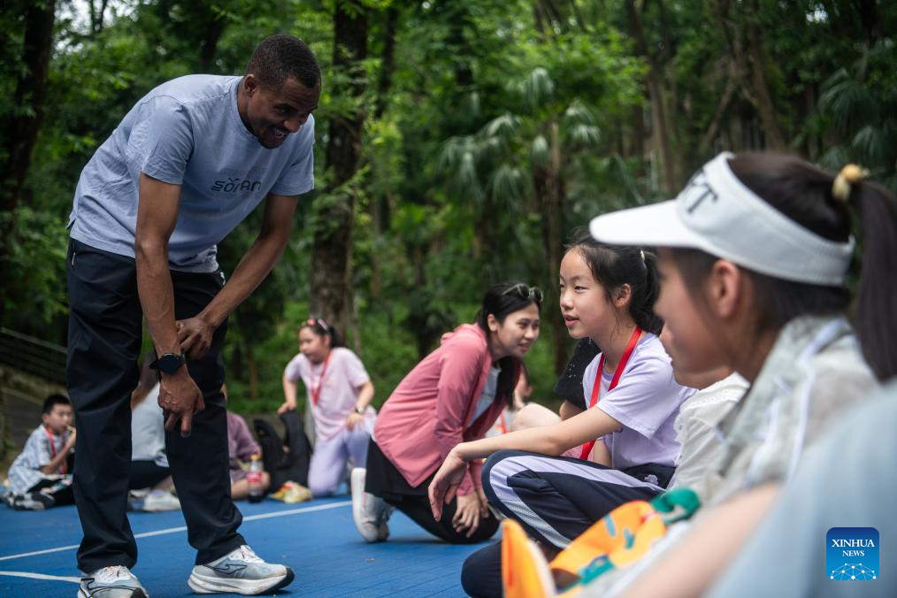 Lugazo Abubakar Lugazo (rear) interacts with children during a voluntary activity in Wuhan, central China's Hubei Province, May 19, 2024.(Xinhua/Wu Zhizun)