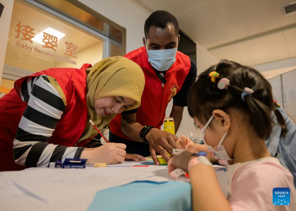 Lugazo Abubakar Lugazo (C) interacts with children during a voluntary activity at a hospital in Wuhan, central China's Hubei Province, May 31, 2024.(Xinhua/Hu Jingwen)