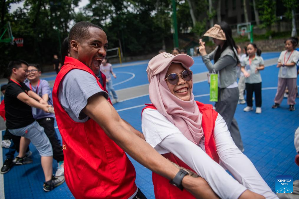 Lugazo Abubakar Lugazo (L, front) joins a tug-of-war game with children during a voluntary activity in Wuhan, central China's Hubei Province, May 19, 2024.(Xinhua/Wu Zhizun)