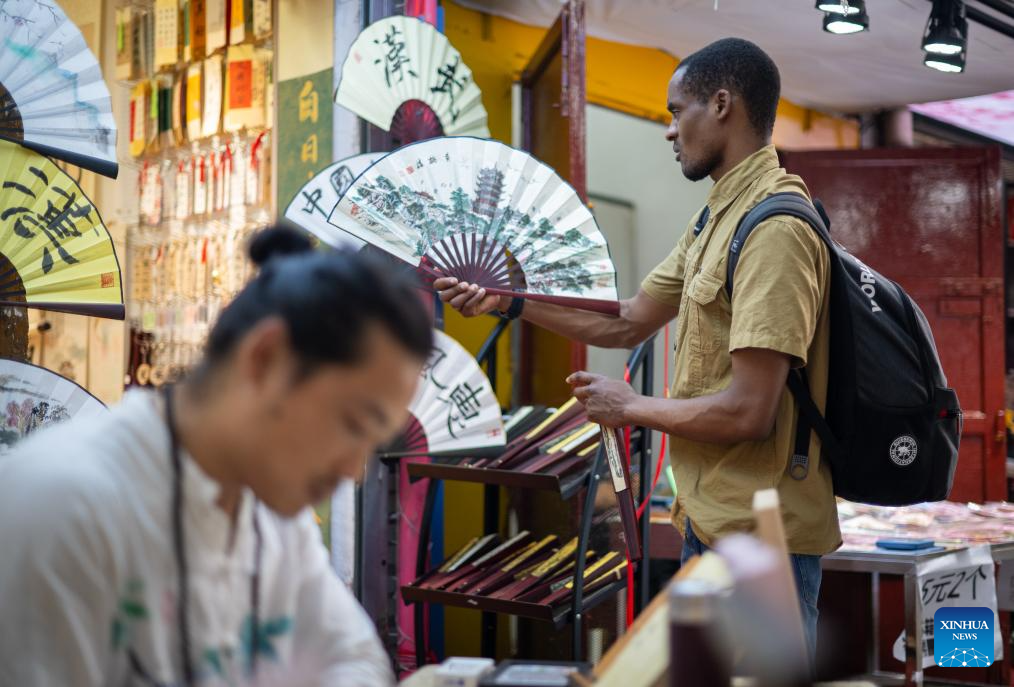Lugazo Abubakar Lugazo (rear) looks at a fan at a store in Wuhan, central China's Hubei Province, June 24, 2024.(Xinhua/Hu Jingwen)