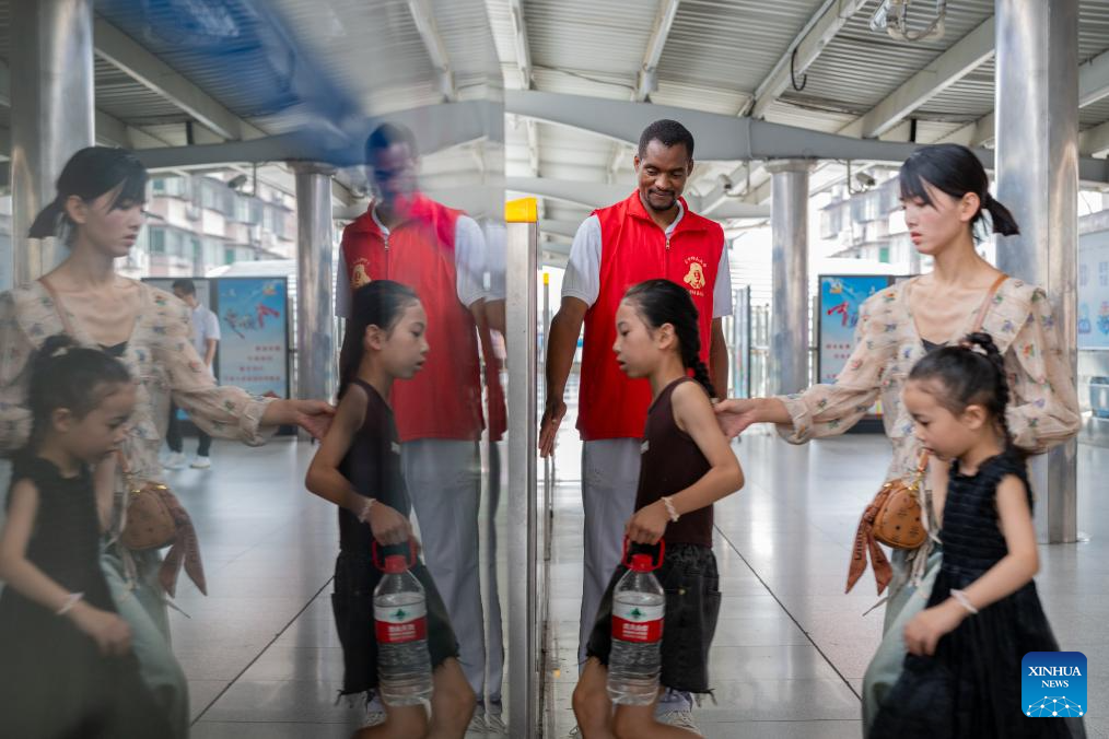 Lugazo Abubakar Lugazo (rear) guides people to board a metro train at a station in Wuhan, central China's Hubei Province, Aug. 18, 2024.(Xinhua/Hu Jingwen)