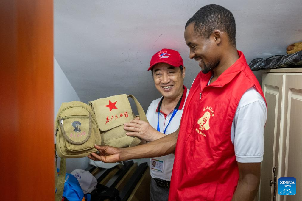 Lugazo Abubakar Lugazo (R) and a volunteer show their bags in Wuhan, central China's Hubei Province, Aug. 18, 2024.(Xinhua/Hu Jingwen)