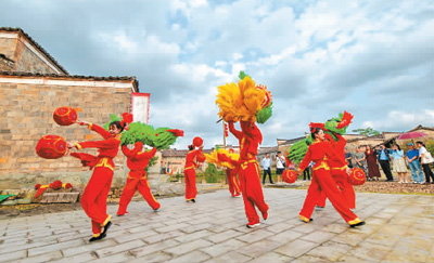 People perform during a performance themed on an intangible cultural heritage in Zhuqiao village, Jinxi county, Fuzhou city, east China’s Jiangxi Province. (Photo/Deng Xingdong)