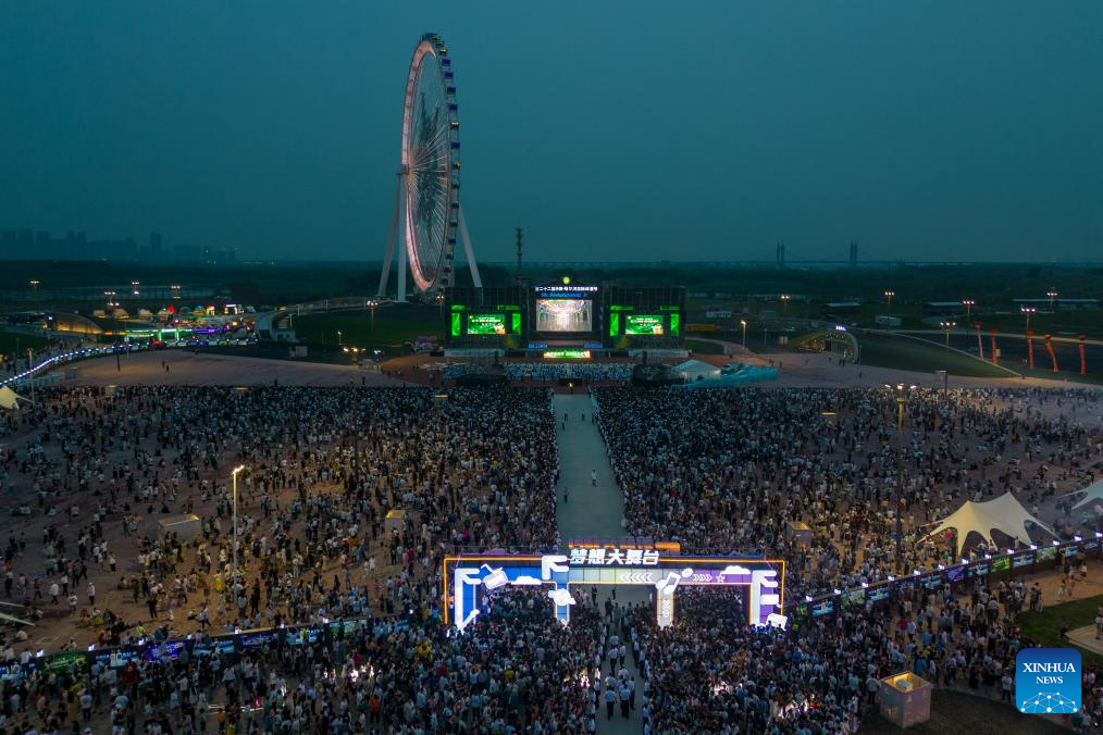 An aerial drone photo taken on Aug. 17, 2024 shows a light show at the 22nd China Harbin International Beer Festival in Harbin, northeast China's Heilongjiang Province. Known as China's "Ice City", Harbin has a reputation for its cool weather and diversified attractions, even during the summer months, which helps it remain attractive to tourists throughout the year. (Xinhua/Wang Jianwei)
