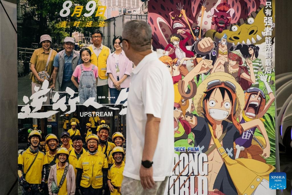 A citizen walks past a movie poster at a cinema in Beijing, capital of China, Aug. 22, 2024. By early Sunday morning, the summer box office period -- June 1 to Aug. 31 -- had amassed 10 billion yuan (1.40 billion U.S. dollars), with cinema admissions totaling 243 million, according to data from ticketing platform Maoyan. (Xinhua/Chu Jiayin)
