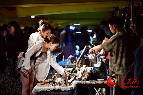 Tourists select products at the creative market in Taoxichuan, a cultural and creative block in Jingdezhen city, east China's Jiangxi Province. (People's Daily Online/Shi Yu)
