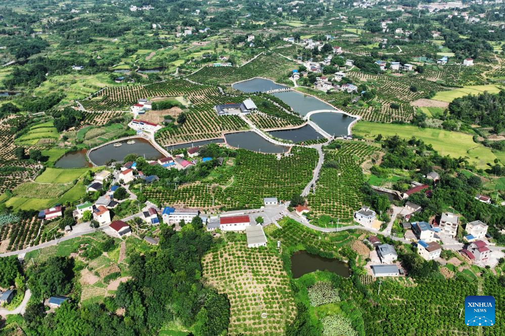 An aerial drone photo taken on Aug. 7, 2024 shows a view of Sanchagou Village at Shengli Town in Wusheng County of Guang'an City, southwest China's Sichuan Province. Guang'an City, located in the eastern part of Sichuan Basin, is the hometown of Deng Xiaoping. With beautiful scenery and rich culture, Guang'an has taken advantages to boost the city's infrastructure construction and industrial development during the building process of the Chengdu-Chongqing economic circle. (Photo by Xia Junlin/Xinhua)