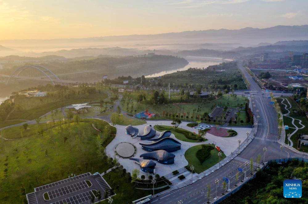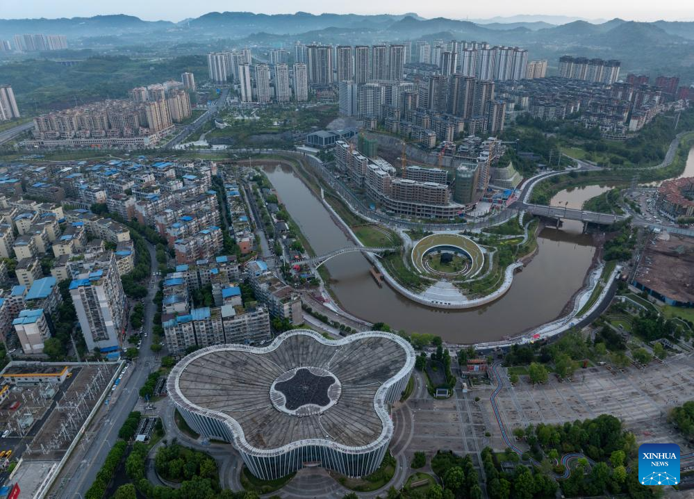 An aerial drone photo taken on July 23, 2024 shows a music park in Guang'an City, southwest China's Sichuan Province. Guang'an City, located in the eastern part of Sichuan Basin, is the hometown of Deng Xiaoping. With beautiful scenery and rich culture, Guang'an has taken advantages to boost the city's infrastructure construction and industrial development during the building process of the Chengdu-Chongqing economic circle. (Photo by Qiu Haiying/Xinhua)