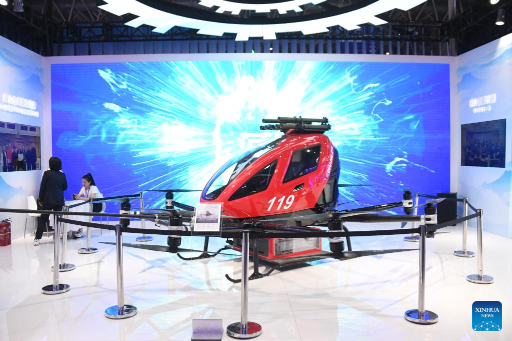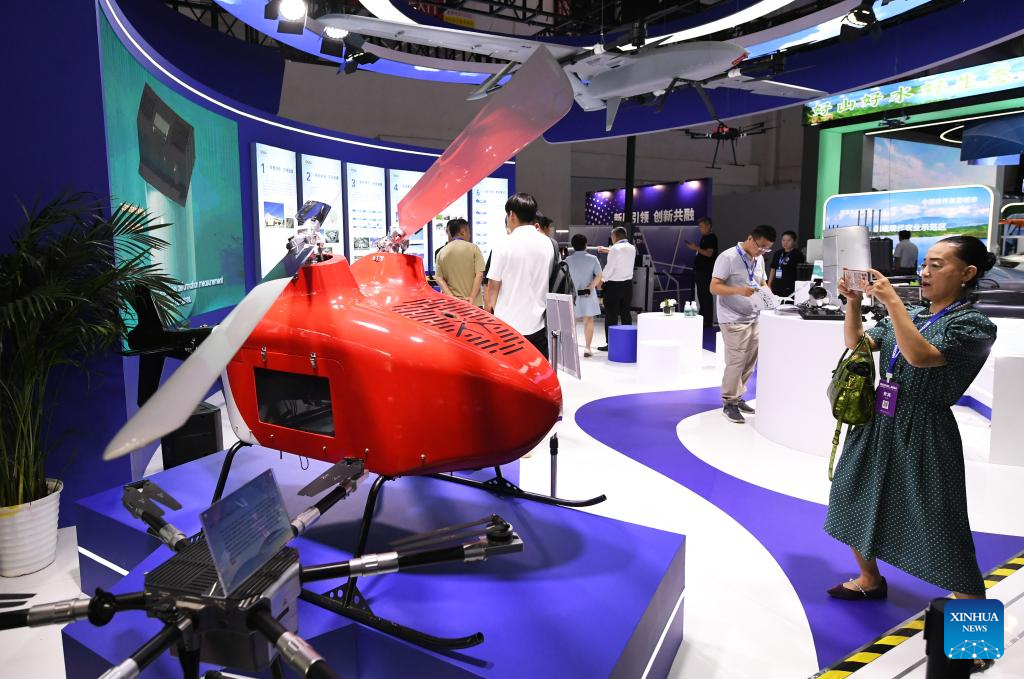 This photo taken on Aug. 23, 2024 shows a firefighting drone at the exhibition area of HICOOL 2024 Global Entrepreneur Summit in Beijing, capital of China. The global entrepreneur summit was held in Beijing from Friday to Sunday. (Xinhua/Ren Chao)