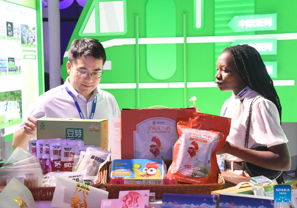 An exhibitor introduces agricultural products at the exhibition area of HICOOL 2024 Global Entrepreneur Summit in Beijing, capital of China, Aug. 23, 2024. The global entrepreneur summit was held in Beijing from Friday to Sunday. (Xinhua/Ren Chao)