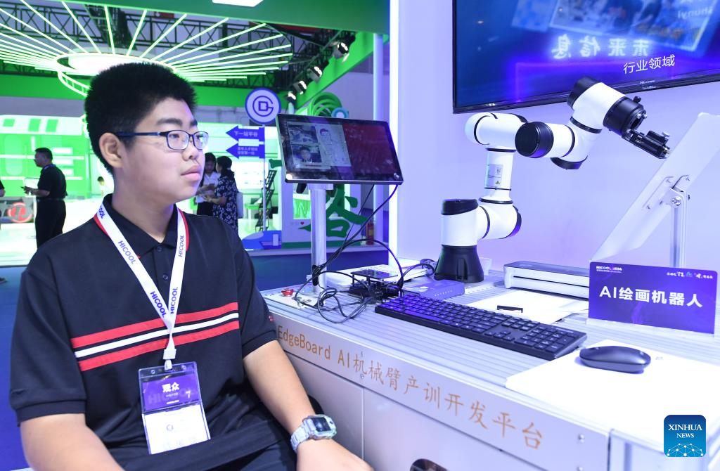 A visitor experiences robot painting at the exhibition area of HICOOL 2024 Global Entrepreneur Summit in Beijing, capital of China, Aug. 24, 2024. The global entrepreneur summit was held in Beijing from Friday to Sunday. (Xinhua/Ren Chao)