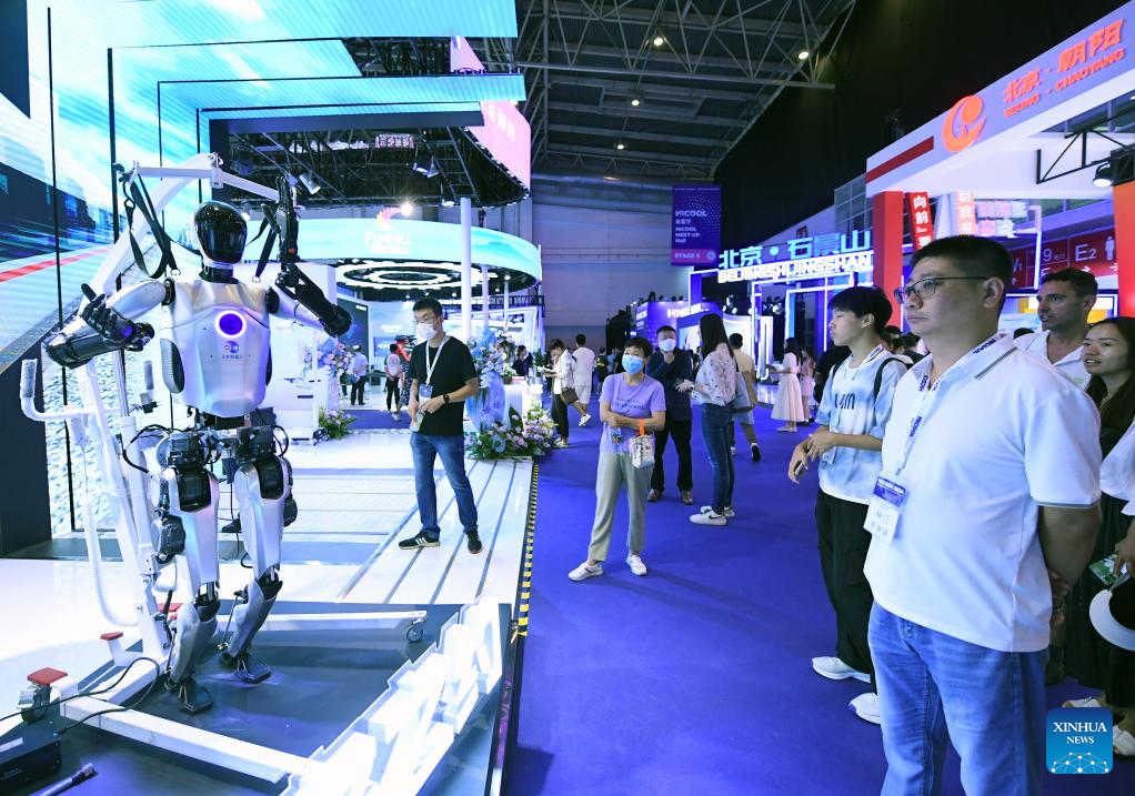 People visit the exhibition area of HICOOL 2024 Global Entrepreneur Summit in Beijing, capital of China, Aug. 24, 2024. The global entrepreneur summit was held in Beijing from Friday to Sunday. (Xinhua/Ren Chao)