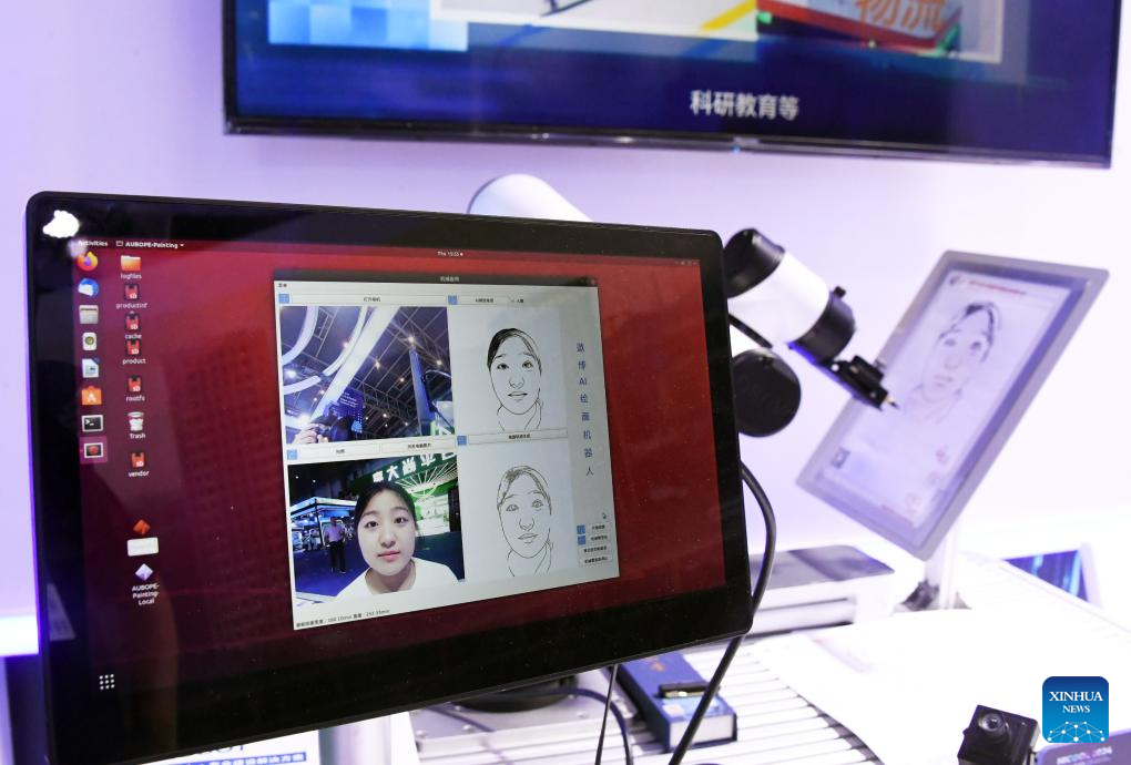This photo taken on Aug. 23, 2024 shows a painting robot at the exhibition area of HICOOL 2024 Global Entrepreneur Summit in Beijing, capital of China. The global entrepreneur summit was held in Beijing from Friday to Sunday. (Xinhua/Ren Chao)