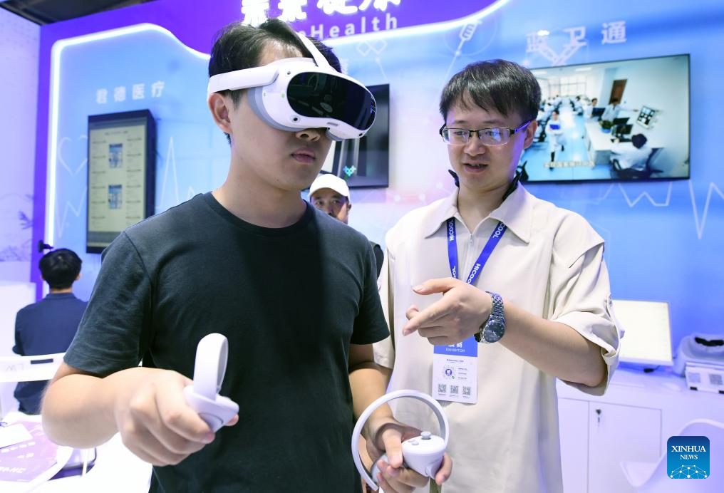 A visitor experiences a MR multi-person collaboration system at HICOOL 2024 Global Entrepreneur Summit in Beijing, capital of China, Aug. 24, 2024. The global entrepreneur summit was held in Beijing from Friday to Sunday. (Xinhua/Ren Chao)