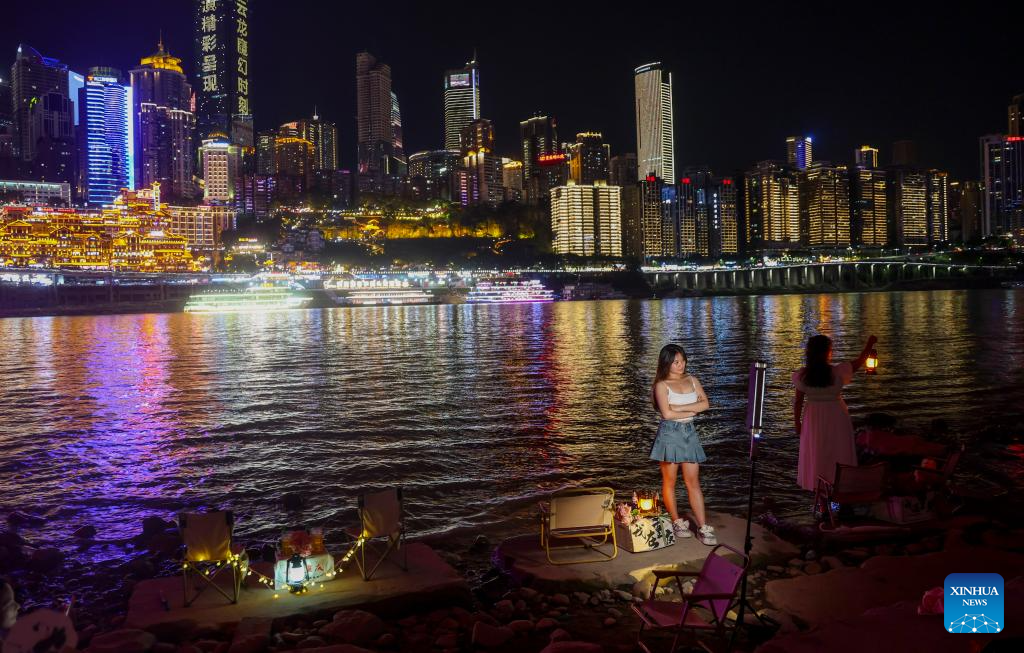 Tourists take boats to enjoy the night view in Chongqing, southwest China, Aug. 21, 2024. Renowned tourist destinations in Chongqing, a city known for its high temperatures, attract many tourists in summer. (Xinhua/Wang Quanchao)