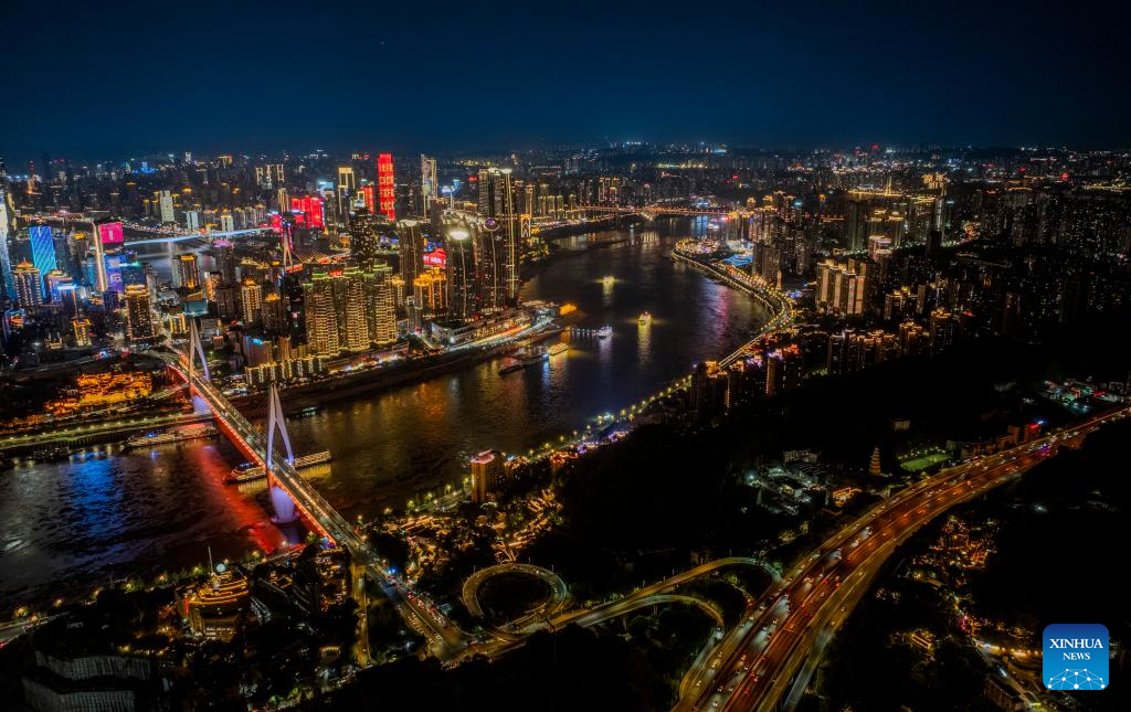 A drone photo taken on Aug. 23, 2024 shows the night view of downtown Chongqing in southwest China. Renowned tourist destinations in Chongqing, a city known for its high temperatures, attract many tourists in summer. (Xinhua/Liu Chan)