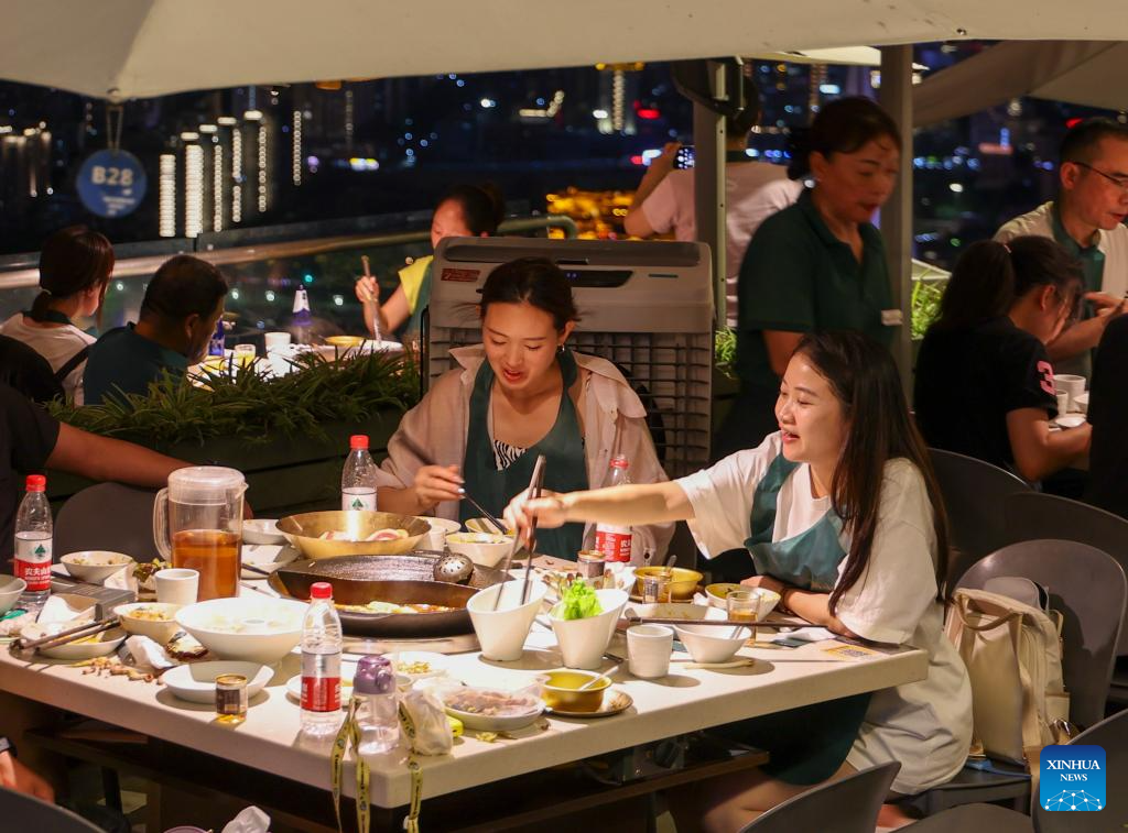 Tourists enjoy Chongqing hotpot in a restaurant at the Nanshan scenic spot in Chongqing, southwest China, Aug. 23, 2024. Renowned tourist destinations in Chongqing, a city known for its high temperatures, attract many tourists in summer. (Xinhua/Liu Chan)