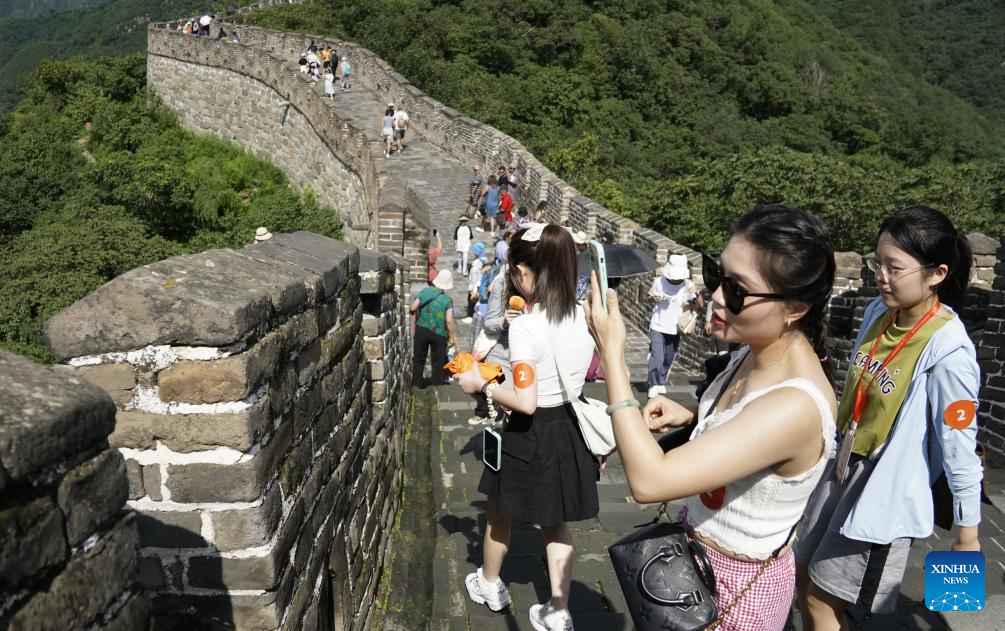 Participants of a cross-Strait journalism camp visit the Mutianyu section of the Great Wall in Beijing, capital of China, Aug. 25, 2024. (Xinhua/Li Xin)