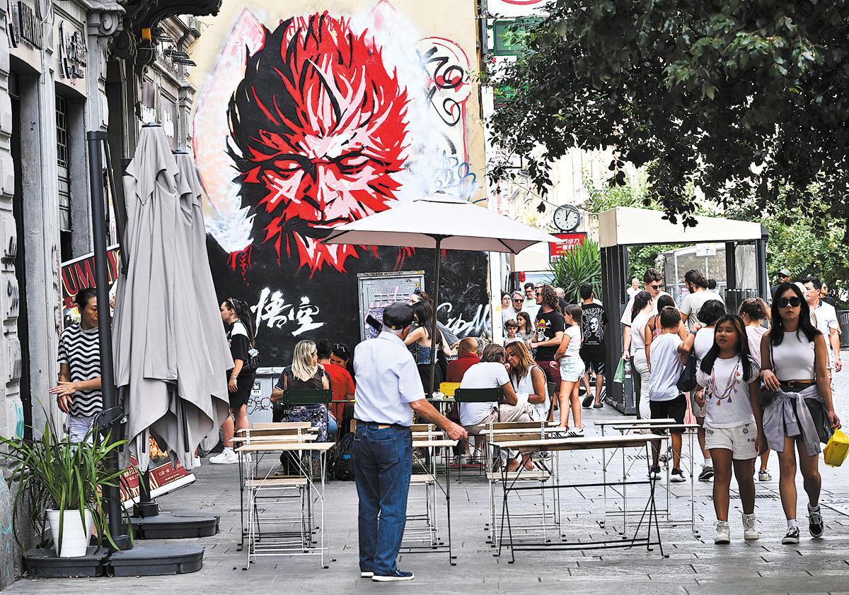 People gather on Friday in Milan, Italy, near graffiti based on Black Myth: Wukong, a Chinese-made video game that has gone viral globally after its official release on Tuesday. (ALBERTO LINGRIA/XINHUA)