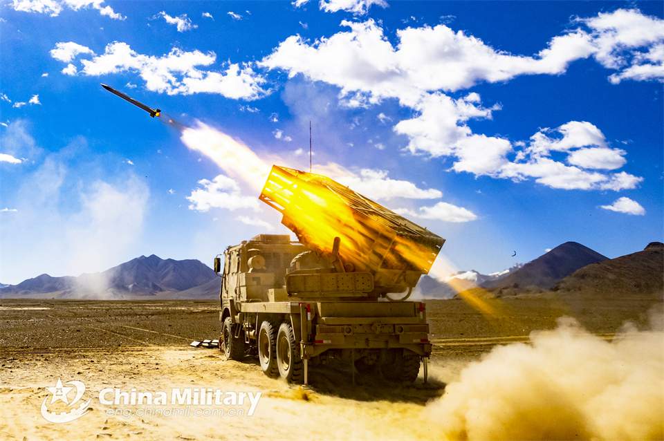 A vehicle-mounted 122mm rocket launcher system attached to an artillery element of the PLA Army fires at mock targets during a live-fire training exercise on July 10, 2024. (eng.chinamil.com.cn/Photo by He Wenqi)