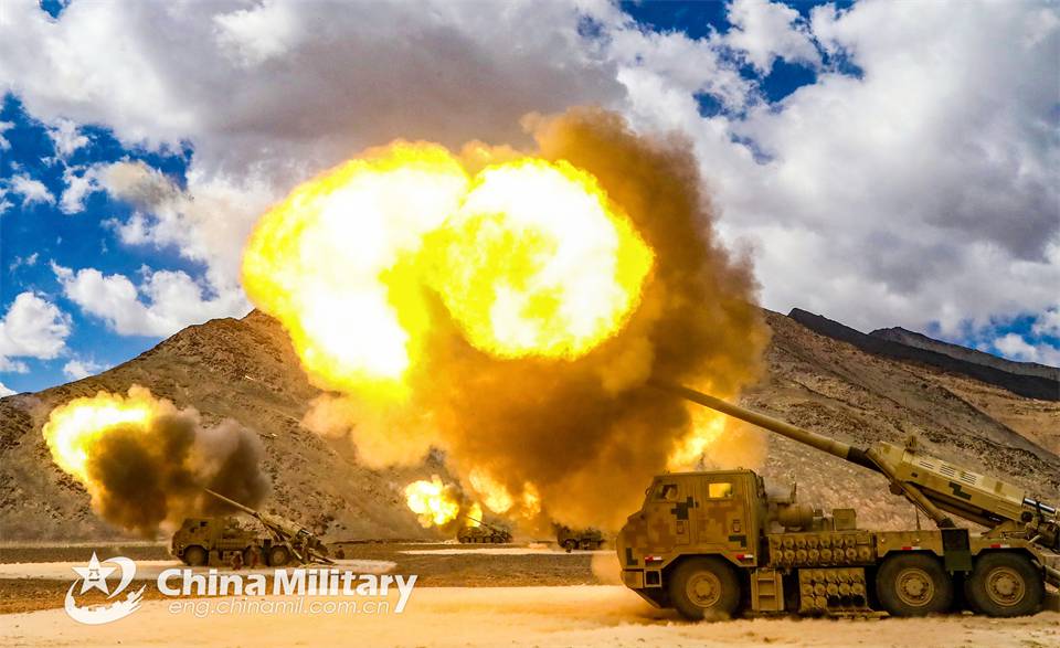 A vehicle-mounted 155mm truck-mounted howitzer attached to an artillery element of the PLA Army fires at mock targets during a live-fire training exercise on July 9, 2024. (eng.chinamil.com.cn/Photo by He Wenqi)