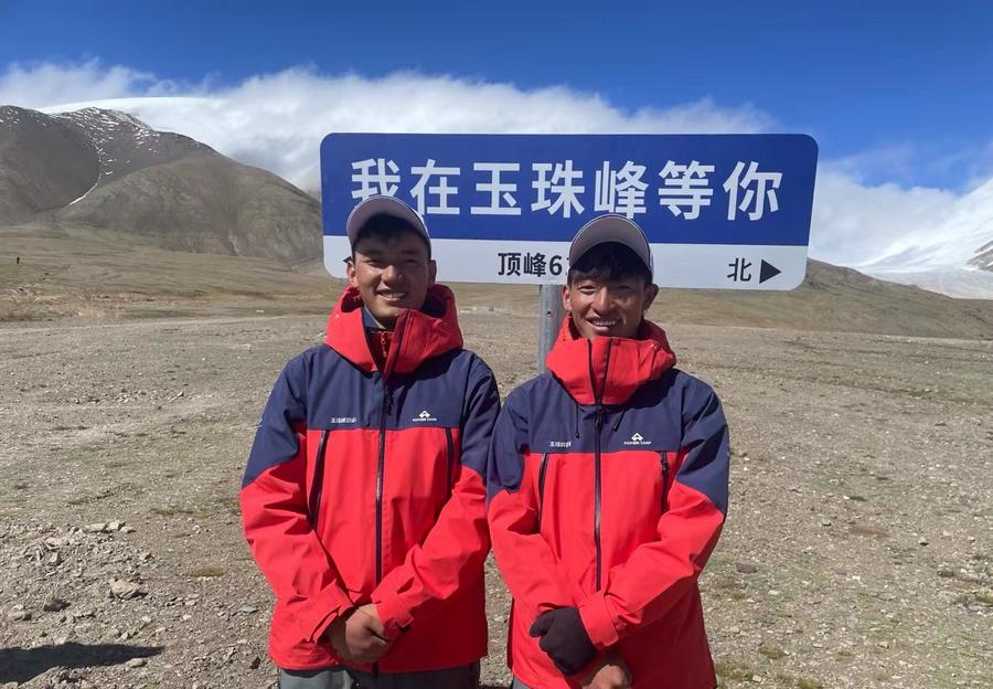 Tashi Dorje (L) and Cedin pose for a photo at the Yuzhu Peak base camp in Qumalai County of Yushu Tibetan Autonomous Prefecture in northwest China's Qinghai Province, Aug. 8, 2024. (Xinhua/Li Linhai)