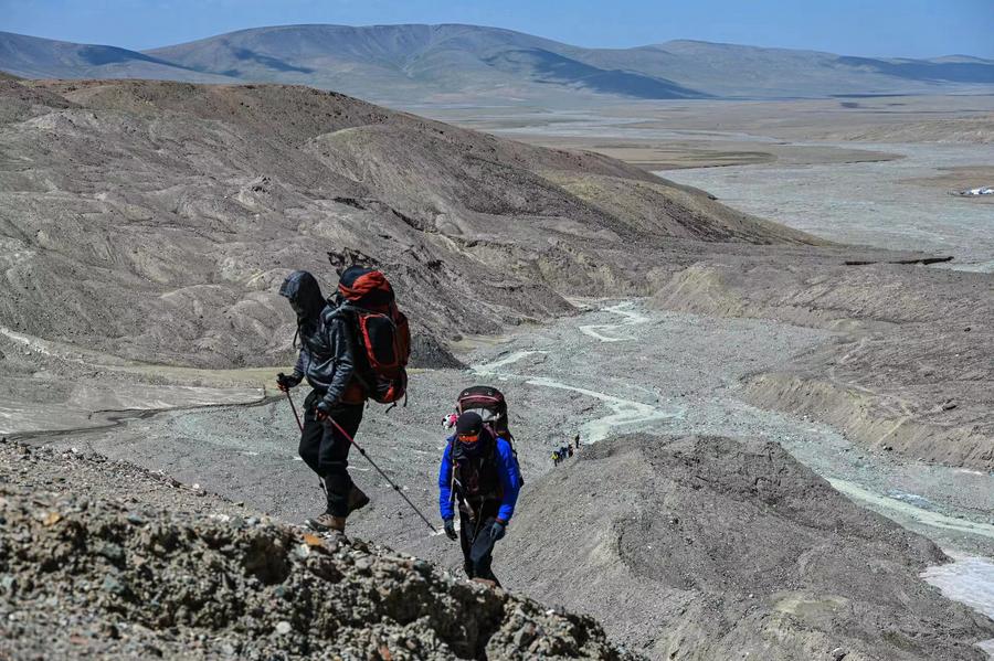 Cedin (1st R) and team members climb Yuzhu Peak in Qumalai County of Yushu Tibetan Autonomous Prefecture in northwest China's Qinghai Province, Aug. 16, 2024. (Xinhua)