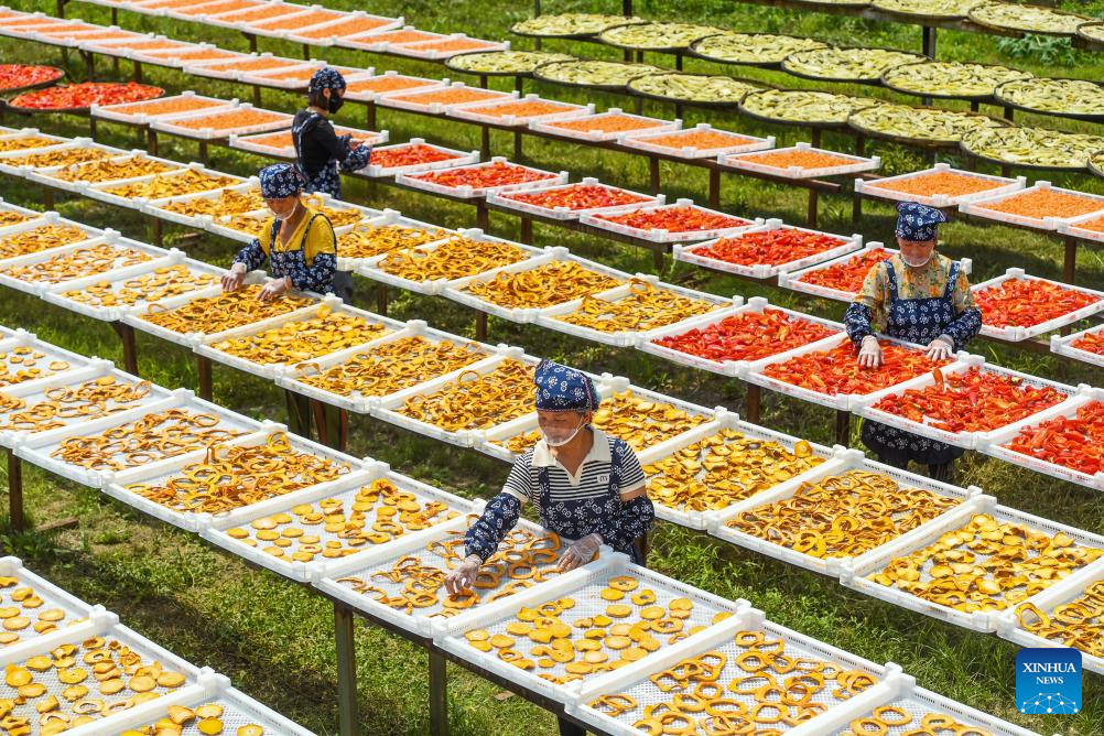 Villagers dry agricultural products in Lutian Village of Tonggu County, Yichun City, east China's Jiangxi Province, on Aug. 26, 2024. (Photo by Zhou Liang/Xinhua)