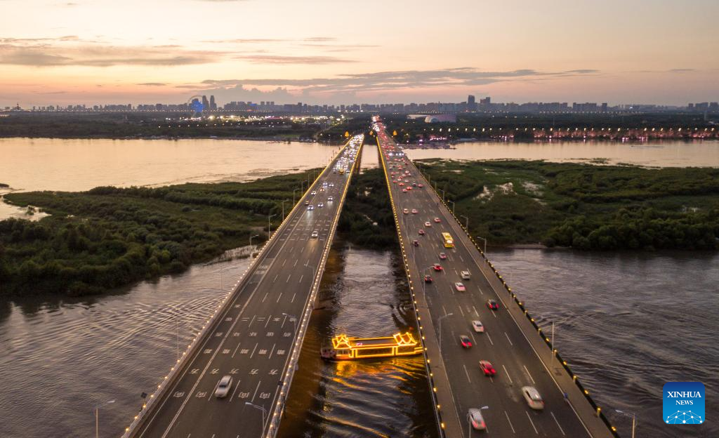 An aerial drone photo taken on Aug. 15, 2024 shows vehicles running on the Songhua River bridge while a ship passes underneath, in Harbin, northeast China's Heilongjiang Province. Known as China's "Ice City", Harbin has a reputation for its cool weather and diversified attractions, even during the summer months, which helps it remain attractive to tourists throughout the year. (Xinhua/Wang Jianwei)