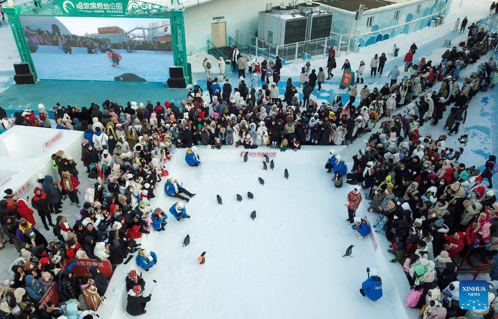 An aerial drone photo taken on Jan. 5, 2024 shows tourists watching a parade of penguins at the Harbin Polarpark in Harbin, northeast China's Heilongjiang Province. Known as China's "Ice City", Harbin has a reputation for its cool weather and diversified attractions, even during the summer months, which helps it remain attractive to tourists throughout the year. (Xinhua/Wang Jianwei)