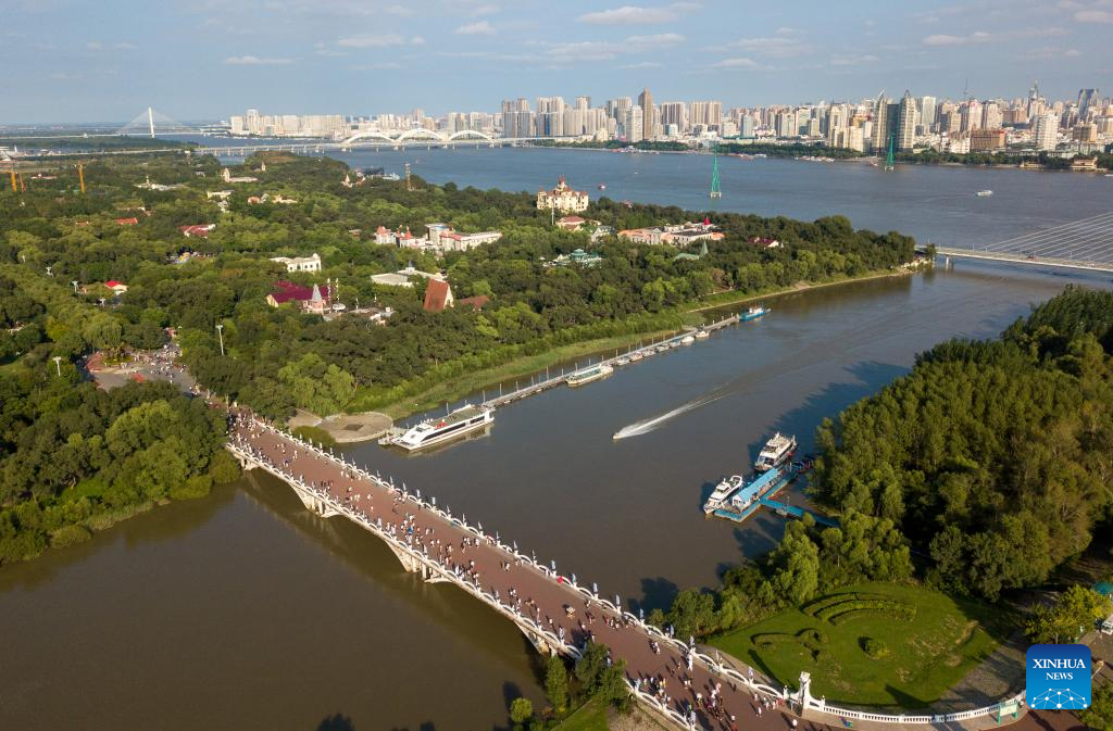 An aerial drone photo taken on Aug. 20, 2024 shows a view of the Sun Island scenic spot in the Taiyangdao (Sun Island) National Wetland Park in Harbin, northeast China's Heilongjiang Province. Known as China's "Ice City", Harbin has a reputation for its cool weather and diversified attractions, even during the summer months, which helps it remain attractive to tourists throughout the year. (Xinhua/Wang Song)