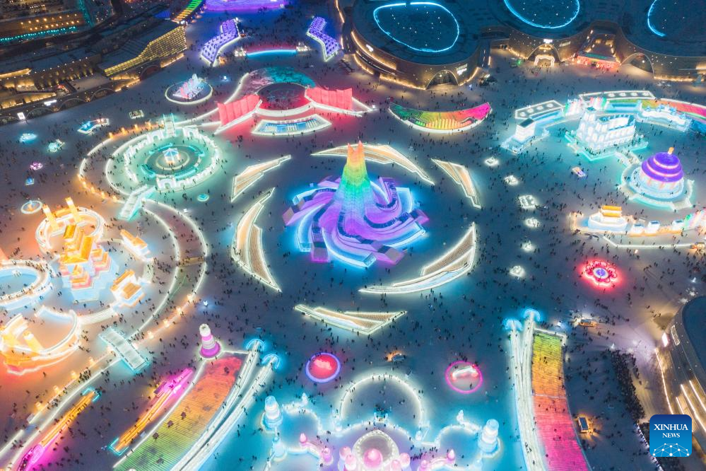 An aerial drone photo shows tourists visiting the Harbin Ice-Snow World in Harbin, northeast China's Heilongjiang Province, Jan. 1, 2024. Known as China's "Ice City", Harbin has a reputation for its cool weather and diversified attractions, even during the summer months, which helps it remain attractive to tourists throughout the year. (Xinhua/Xie Jianfei)
