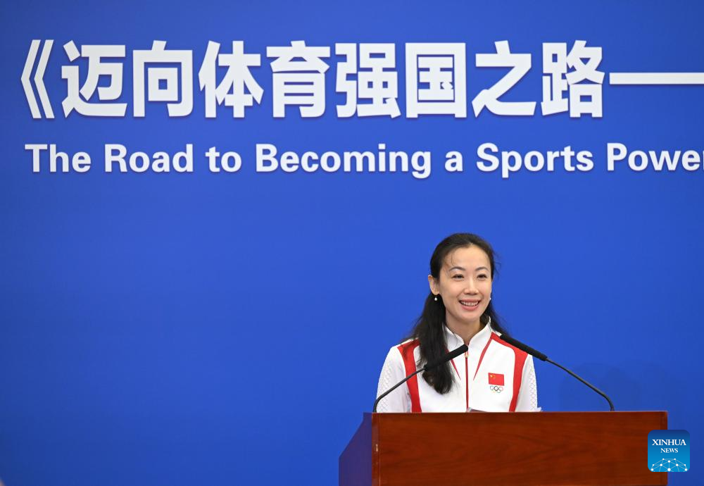 Feng Yu, team leader of Chinese artistic swimming team and representative of gold medalists at the Paris 2024 Olympics, speaks during a report launch ceremony in Beijing, capital of China, Aug. 27, 2024. (Xinhua/Jin Liangkuai)