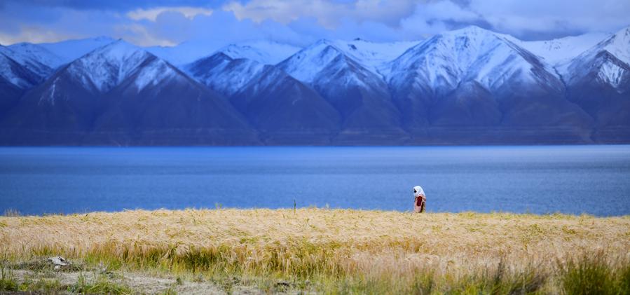 Photo taken on Sept. 23, 2021 shows ripe highland barley against the backdrop of snow-covered mountains at Ombu Township, Nyima County, Nagqu City of southwest China's Xizang Autonomous Region. (Xinhua/Jigme Dorje)