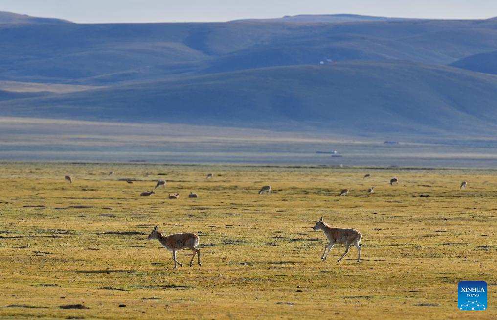 Tibetan antelopes are pictured in Serling Tso national nature reserve in Nagqu City, southwest China's Xizang Autonomous Region, Aug. 26, 2024. (Xinhua/Zhang Rufeng)