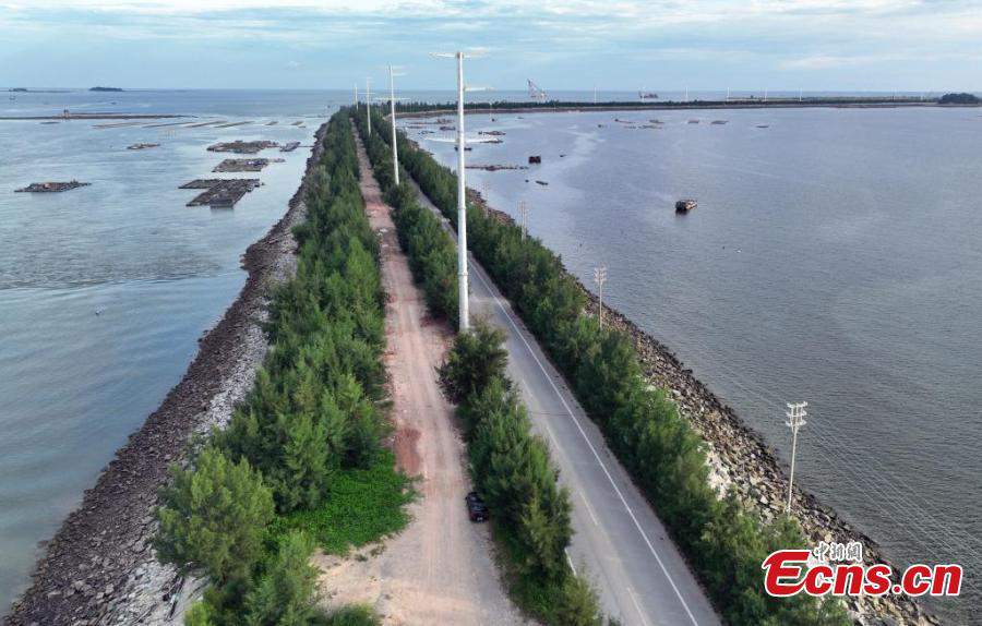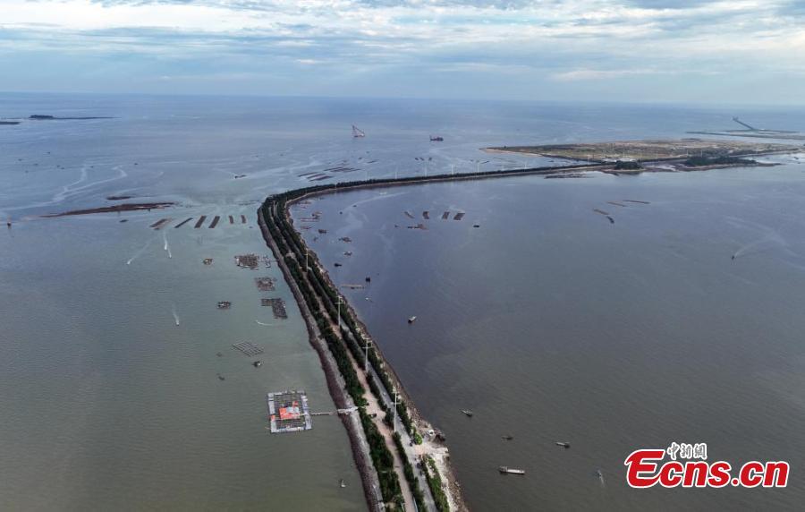 The 13-kilometer-long road, which crosses the bay, divides the sea between Qinzhou Port and Sanniang Bay, with the western side planned for urban industrial development and the eastern side left for the white dolphins.