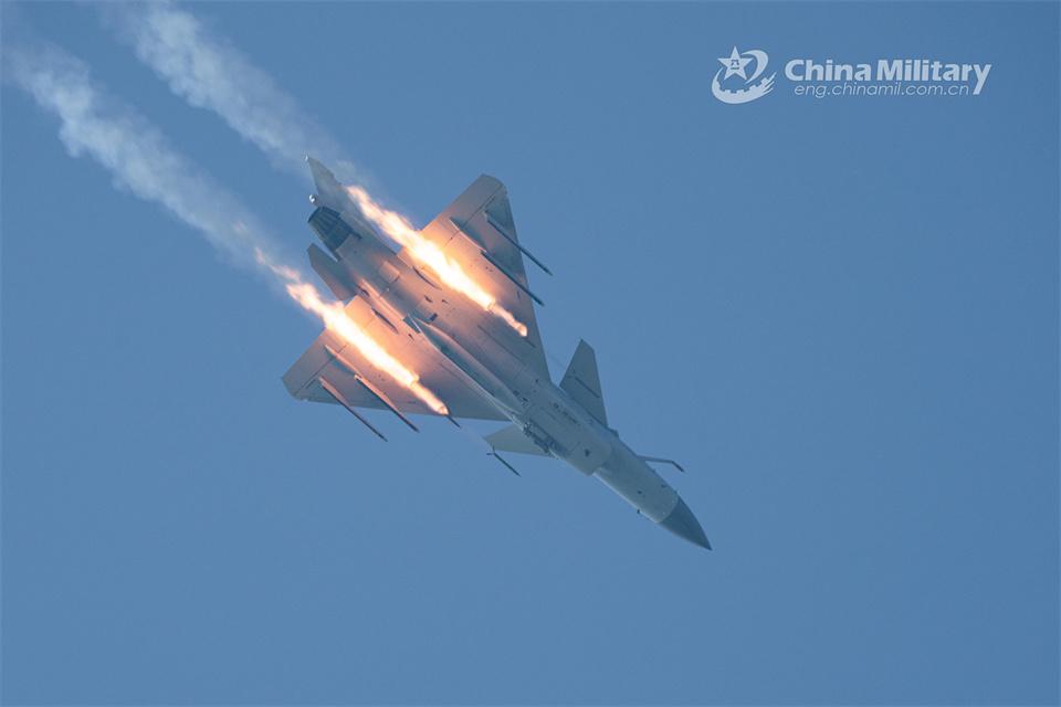 A J-10 fighter jet attached to an aviation brigade under the PLA Southern Theater Command fires at ground target during a live-fire training exercise on August 1, 2024. (eng.chinamil.com.cn/Photo by Wang Guoyun)