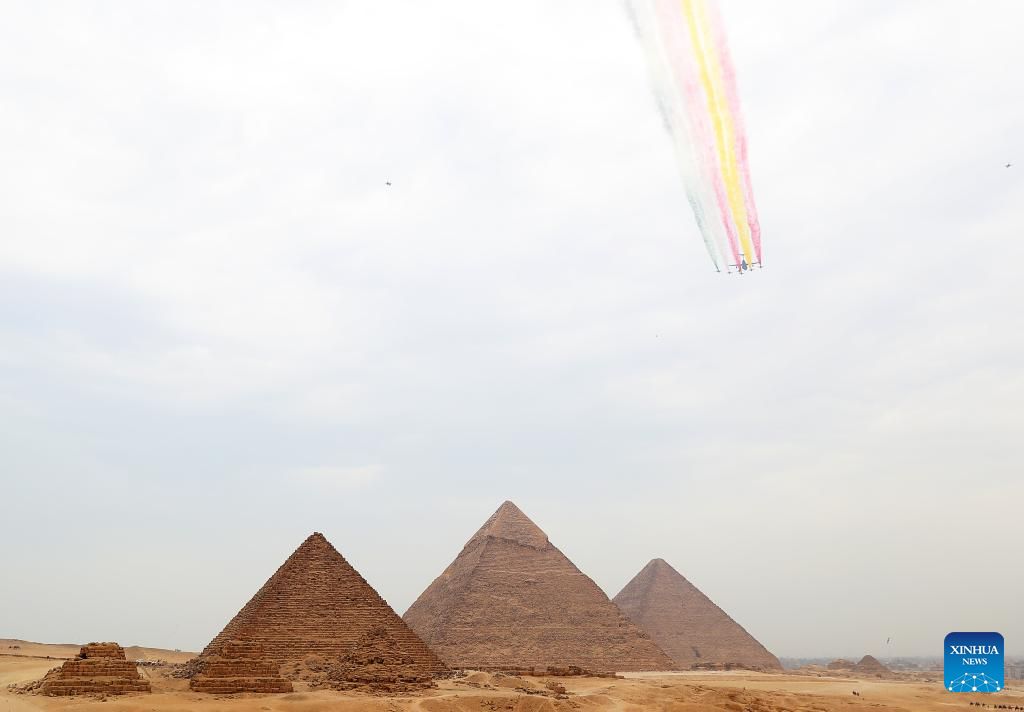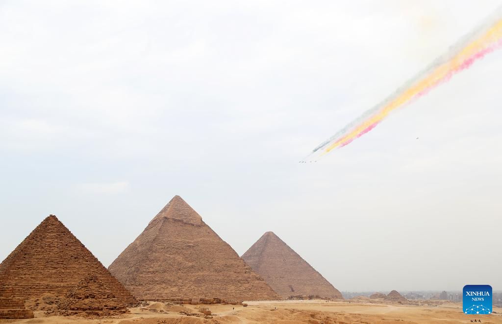 J-10 stealth fighter jets from the Bayi Aerobatic Team fly over the Giza Pyramids scenic spot in Giza, Egypt, Aug. 28, 2024. The flight formation is in Egypt for an air show, scheduled from Sept. 3 to 5. (Xinhua/Sui Xiankai)
