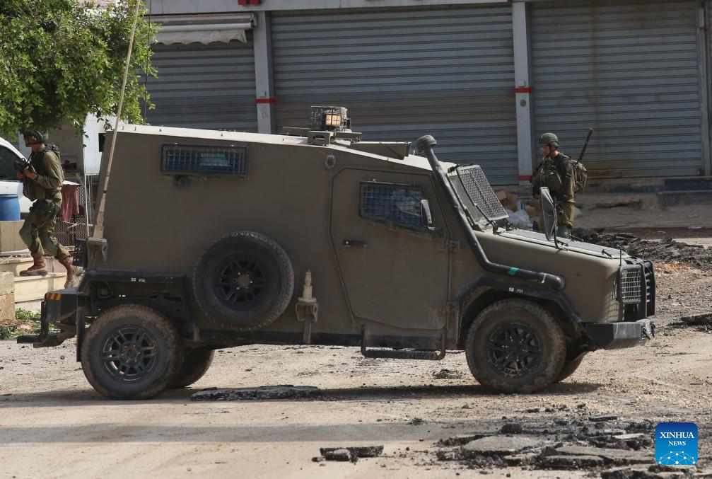 An Israeli military vehicle is seen during an Israeli operation in the northern West Bank city of Jenin, on Aug. 28, 2024. At least 10 Palestinians were killed on Wednesday by Israeli shelling and gunfire in the northern West Bank, according to the Ramallah-based Palestinian Health Ministry. (Photo by Nidal Eshtayeh/Xinhua)
