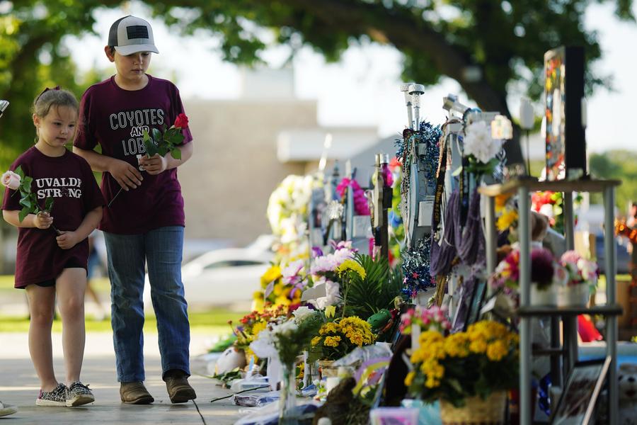 Children mourn for victims of a school mass shooting at a square in Uvalde, Texas, the United States, on May 24, 2023. (Xinhua/Wu Xiaoling)