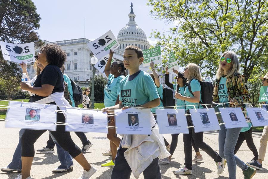 People display photos of victims of gun violence during a march to the Capitol to protest for a ban on assault weapons, in Washington, D.C., the United States, on April 17, 2023. (Photo by Aaron Schwartz/Xinhua)