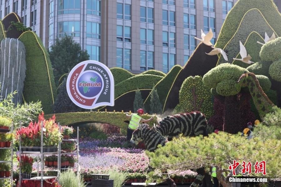 Workers set up a flower bed to greet the upcoming 2024 FOCAC Summit in Beijing, Aug. 27, 2024. (Photo: China News Service/Jiang Qiming)