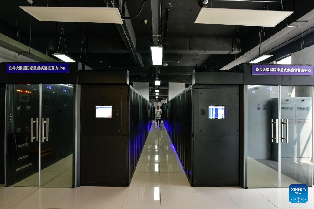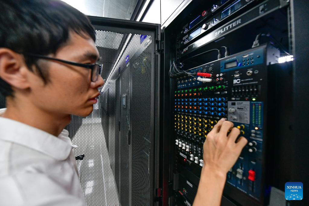 A staff member checks the operation of devices at the State Key Laboratory of Public Big Data at Guizhou University in Guiyang, southwest China's Guizhou Province, Aug. 29, 2024. As the first of its kind in the field of big data in the country, Guizhou University's State Key Laboratory of Public Big Data has three stable research directions, including multi-source data fusion and integration technology, public big data security and privacy protection, block data and regional governance. (Xinhua/Yang Wenbin)