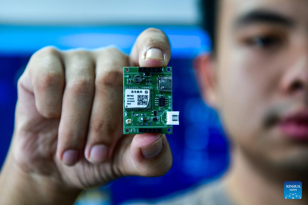 A student shows a high-precision positioning chip at the State Key Laboratory of Public Big Data at Guizhou University in Guiyang, southwest China's Guizhou Province, Aug. 29, 2024. As the first of its kind in the field of big data in the country, Guizhou University's State Key Laboratory of Public Big Data has three stable research directions, including multi-source data fusion and integration technology, public big data security and privacy protection, block data and regional governance. (Xinhua/Yang Wenbin)